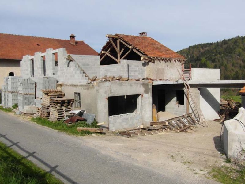 Chantier de rénovation d’une maison avec surélévation en parpaing et toiture partiellement démontée – AK Rénovation, Pays de Gex